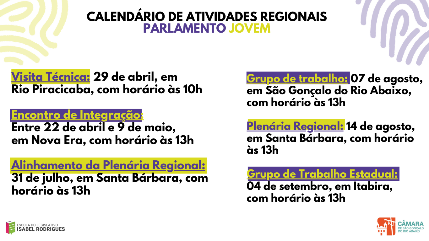 O Calendário de Atividades Regionais, do Polo Médio Piracicaba, do programa Parlamento Jovem, sofreu alteração. A Visita Técnica, antes agendada para Itabira, no dia 10 de abril, passou para a cidade de Rio Piracicaba, no dia 29 do mesmo mês. Já o Grupo de Trabalho Estadual, seguiu no dia 4 de setembro, mas sofrendo mudança de sede, de Rio Piracicaba para Itabira. As demais atividades seguiram com mesma data e local, conforme calendário a seguir: