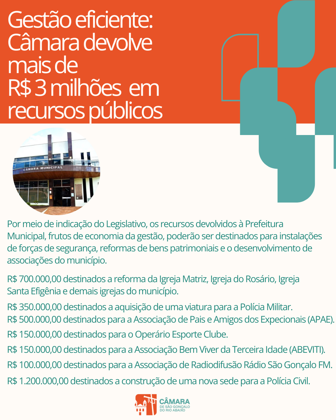 A devolução de recursos ao final do exercício é uma prática que demonstra equilíbrio financeiro e cooperação institucional entre os poderes, contribuindo diretamente para o fortalecimento das políticas públicas do município. A Câmara Municipal segue empenhada em atuar com transparência, responsabilidade e diálogo, contribuindo para o desenvolvimento do município e para o fortalecimento das instituições públicas, sempre em benefício da comunidade gonçalense.