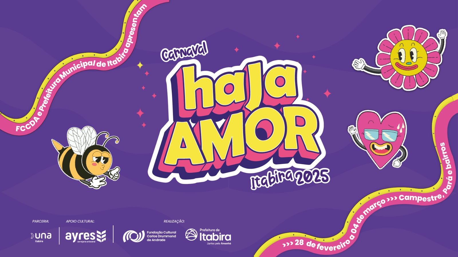 Após o grande sucesso do pré-carnaval, que arrastou milhares de foliões nos blocos pelas ruas da cidade, a Prefeitura Municipal de Itabira e a Fundação Cultural Carlos Drummond de Andrade (FCCDA) apresentam o Carnaval Haja Amor, que ocorrerá entre os dias 28 de fevereiro e 04 de março. Este ano, o evento se inspira na icônica música “Haja Amor”, de Luiz Caldas, cantor, compositor e precursor do Axé Music. Em linha com a proposta de descentralização, a festividade se espalhará por 12 pontos distintos de Itabira, incluindo Ipoema e a Serra dos Alves.