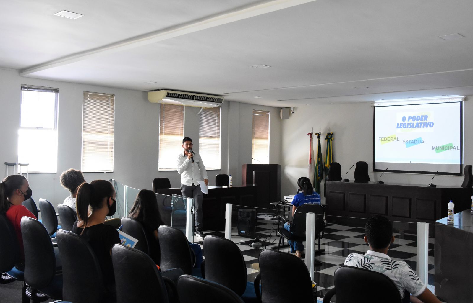 O estudante de Direito e assessor parlamentar Leandro Fonseca ministrou uma palestra sobre a divisão dos três poderes (Executivo, Legislativo e Judiciário), explicando especificamente as suas funções nos âmbitos nacional, estadual e municipal. O palestrante destacou os trabalhos da Legislativo Municipal, falando sobre o que é necessário para se tornar um vereador, quais os seus deveres, o que é um projeto de lei, entre outros.