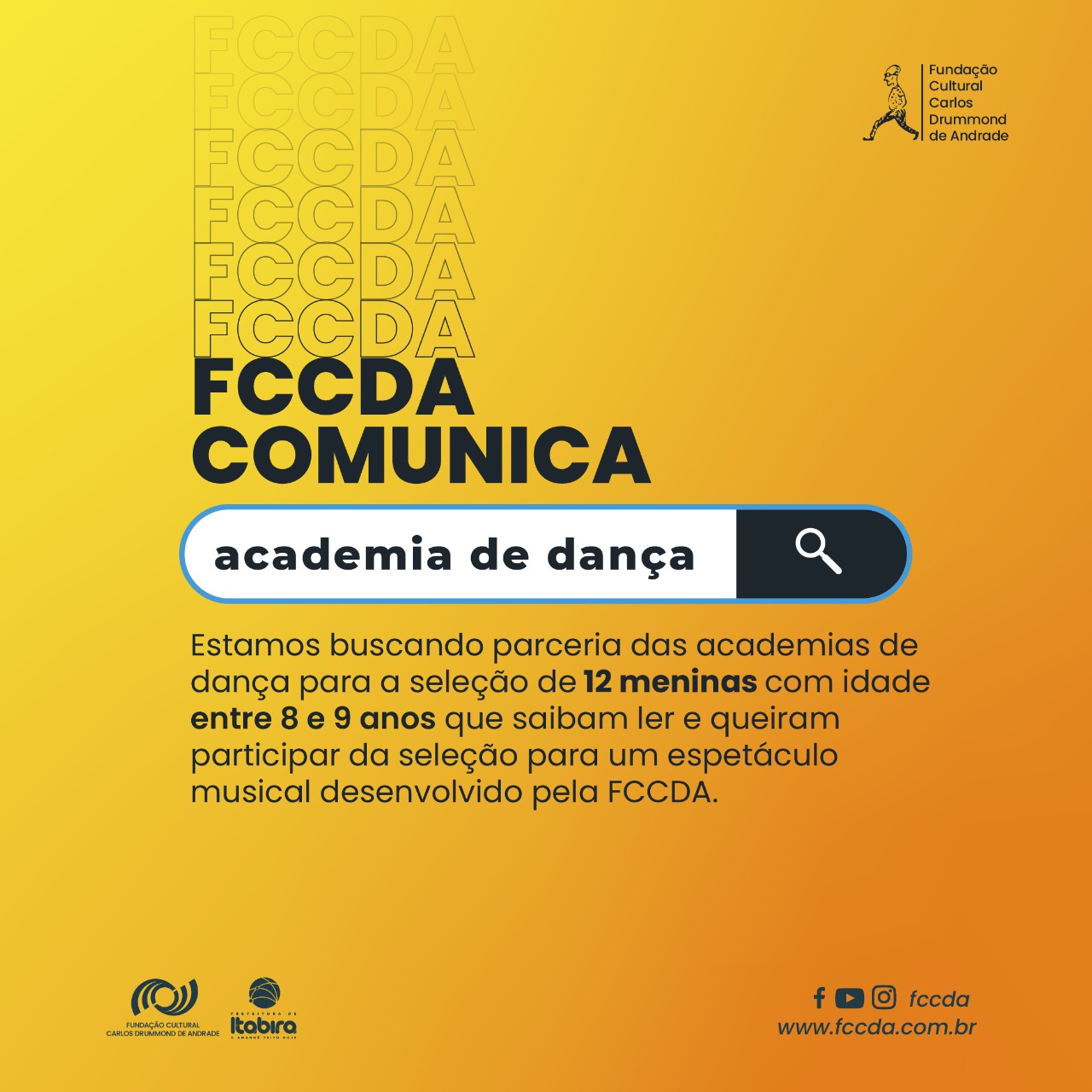 A Fundação Cultural Carlos Drummond de Andrade (FCCDA) está selecionando meninas que dançam e saibam ler com idades entre 8 e 9 anos para a participação de espetáculo musical infantil. A seleção também está aberta para parcerias com academias de dança locais. As inscrições estarão disponíveis entre os dias 8 e 14 de fevereiro.