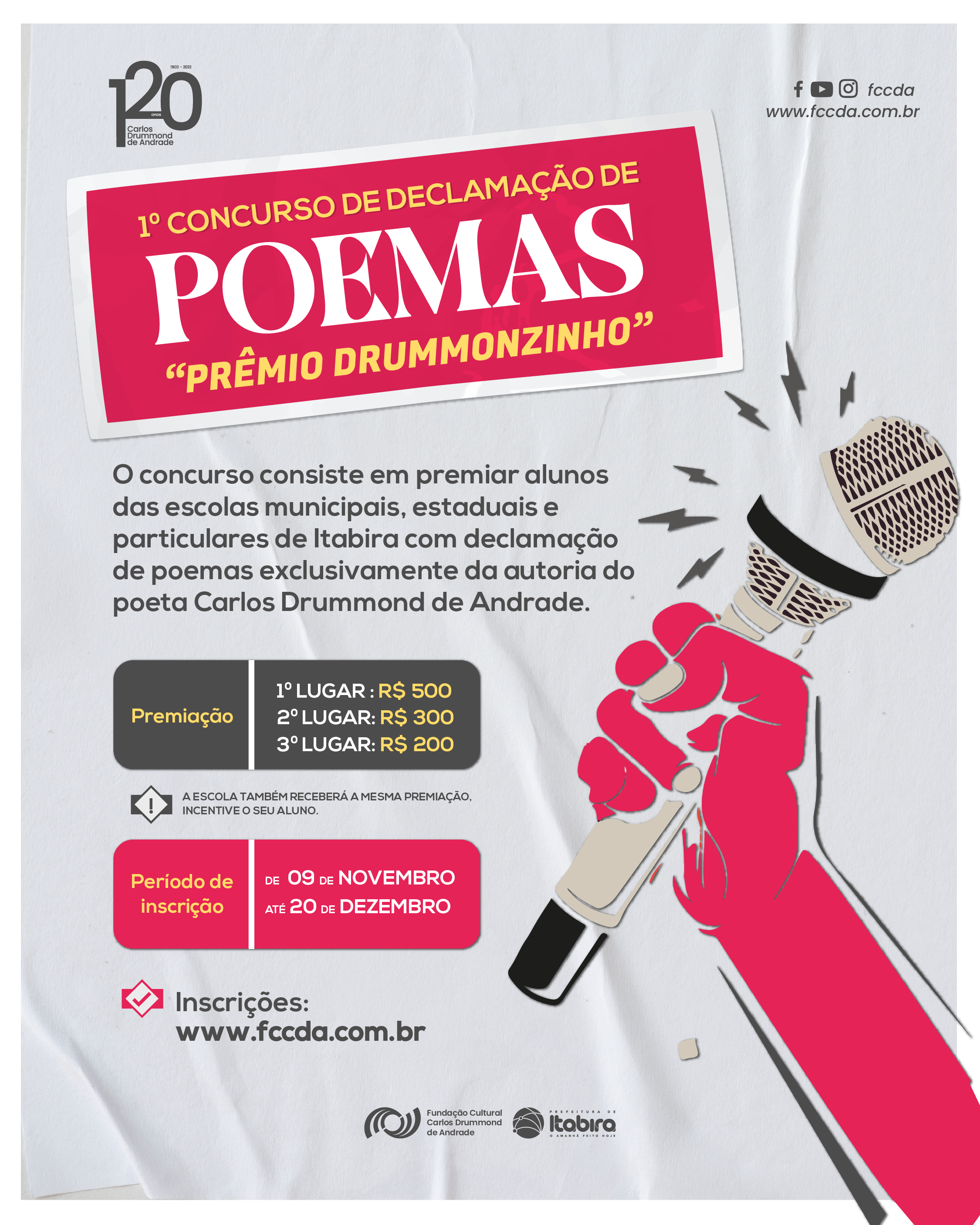 Para mais informações e realização da inscrição os interessados poderão baixar o edital e preencher o formulário no link: https://fccda.com.br/novo/noticias/fccda-lanca-o-1o-concurso-de-declamacao-de-poemas-premio-drummonzinho/