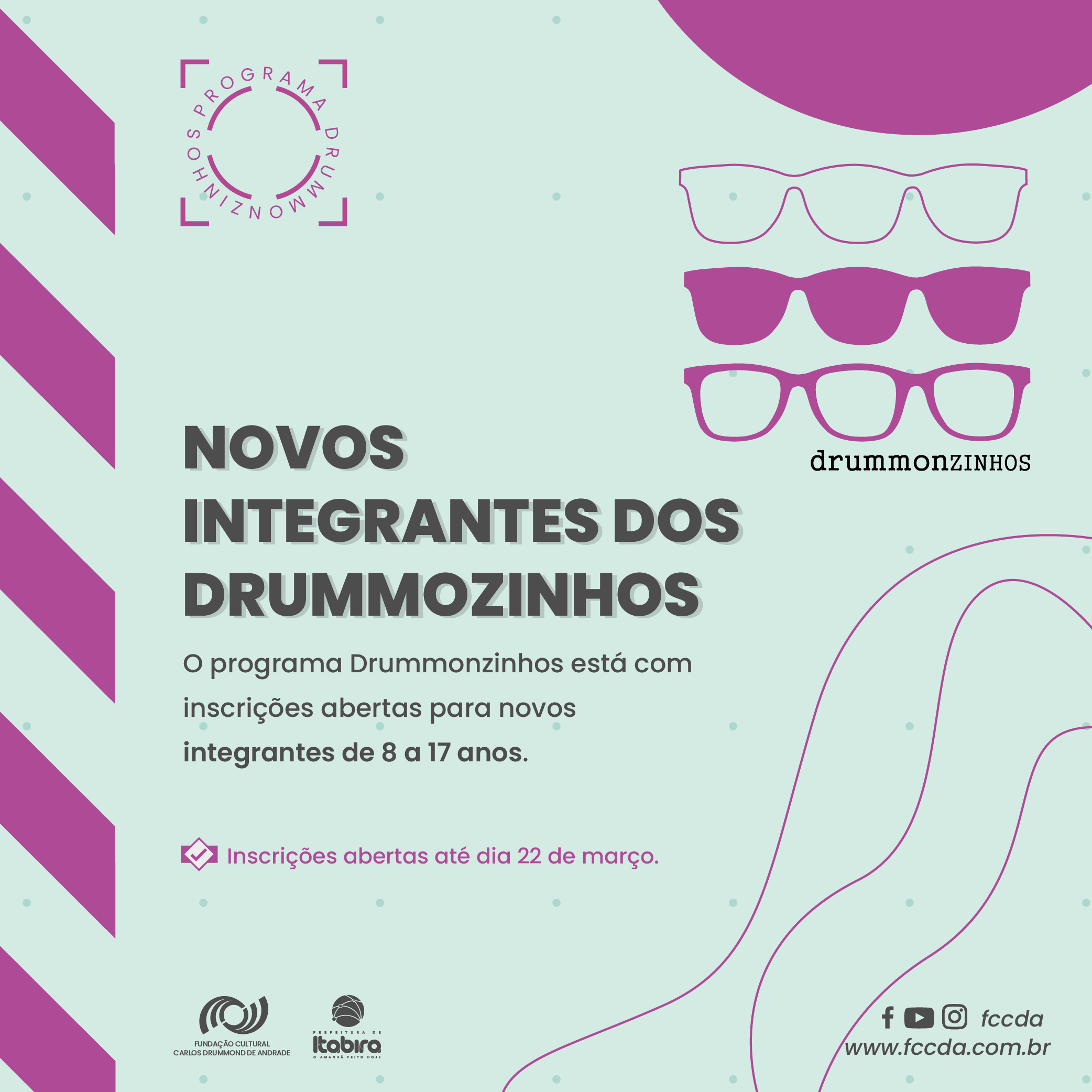 A Fundação Cultural Carlos Drummond de Andrade (FCCDA) divulgou edital de seleção para novos integrantes do programa sociocultural Drummonzinhos. As inscrições estarão abertas entre os dias (4) e (22) de março e poderão ser realizadas de forma on-line ou presencialmente na Casa de Drummond.