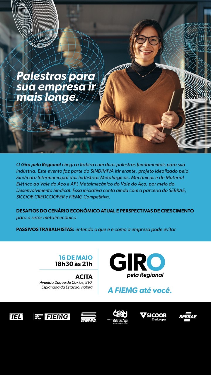 O Giro pela Regional chega à Itabira no próximo dia 16/5, às 18h30, na Acita, que fica na Avenida Duque de Caxias, 810 – Esplanada da Estação, para apresentar aos empresários e toda a comunidade itabirana soluções para aumentar a competitividade e sustentabilidade das indústrias locais.