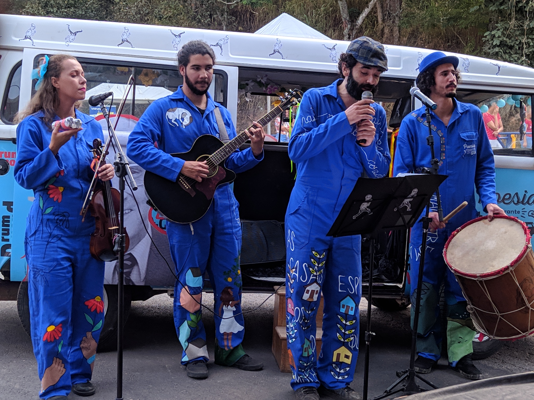 Os artistas transitam com a Kombi itinerante, declamando e cantando as instigantes poesias do poeta maior Carlos Drummond de Andrade.
