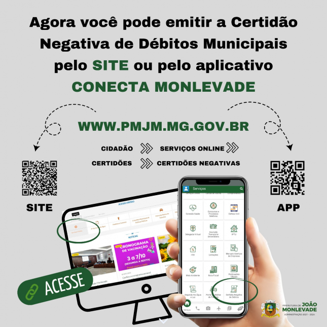 A partir de agora, a emissão da certidão pode ser feita através do site oficial da Prefeitura, o www.pmjm.mg.gov.br, pelo caminho “Cidadão”, “Serviços Online”, “Certidões” e “Certidões Negativas” e também pelo aplicativo Conecta Monlevade, através da aba “Serviços”, opção “Certidão Negativa de Débitos”.