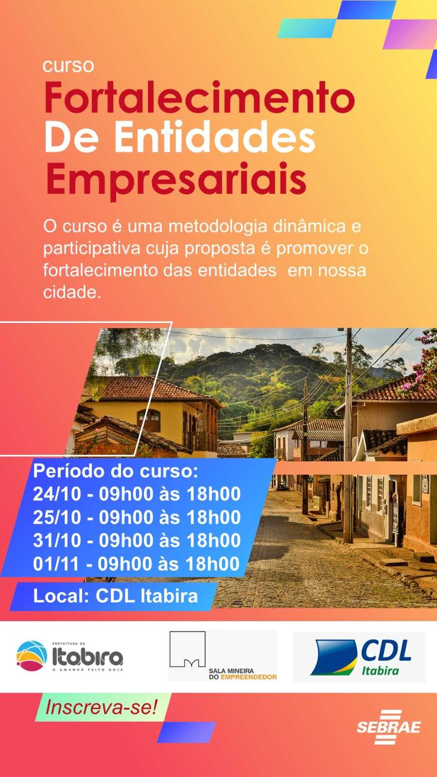O Sebrae Minas e a Prefeitura Municipal de Itabira promovem, a partir de segunda-feira, (24), o curso “Fortalecimento de Entidades Empresariais”. A iniciativa é destinada a líderes, executivos e gerentes de associações da cidade, Câmara de Dirigentes Lojistas e sindicatos patronais. As vagas são gratuitas, limitadas e as inscrições devem ser feitas por meio deste link: