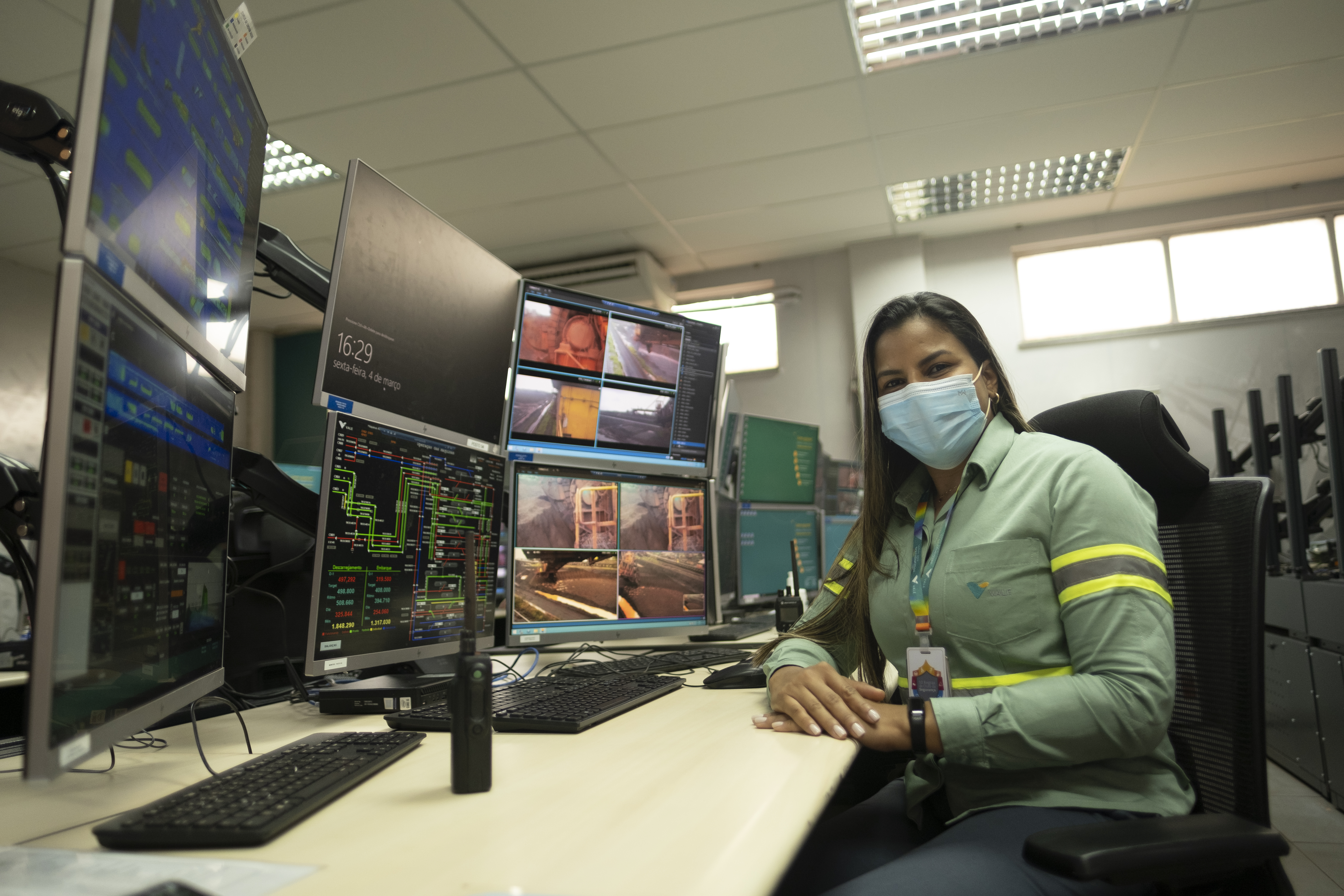 A redução da exposição dos empregados ao risco é um dos benefícios mais relevantes da tecnologia. Ana Carolina Pacheco opera máquinas de pátio no Terminal Ilha Guaíba (TIG). Na operação convencional, ela subia vários degraus para acessar recuperadoras e empilhadeiras de até 40 metros de altura, que movimentam 8 mil toneladas de minério por hora cada uma. A partir deste mês, Carol vai controlar as três máquinas de dentro do Centro de Controle.