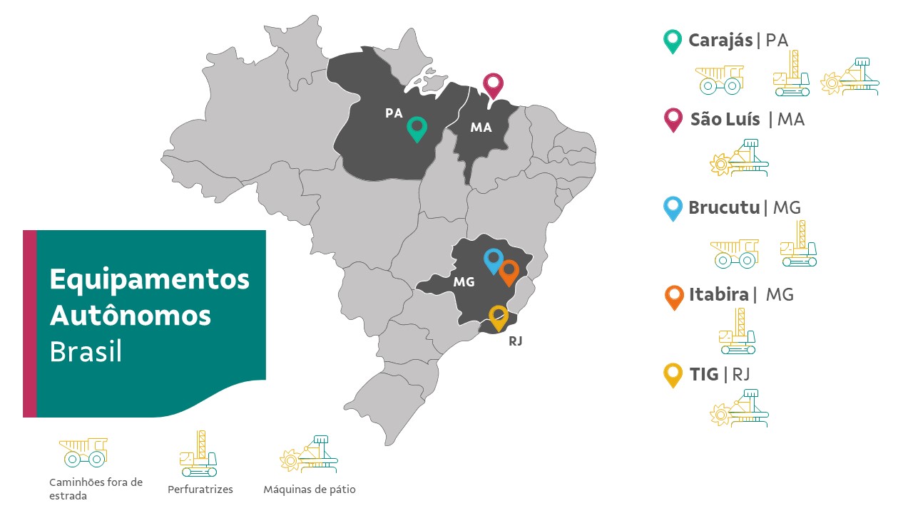 Os primeiros equipamentos autônomos a entrar em operação foram caminhões fora de estrada e perfuratrizes, em 2018, na mina de Brucutu, em São Gonçalo do Rio Abaixo (MG). Atualmente estão operando também caminhões fora de estrada, perfuratrizes e máquinas de pátio em Carajás (PA); perfuratrizes em Itabira (MG); e os pátios inaugurados este ano em São Luís e Mangaratiba (RJ). Também há perfuratrizes e carregadeiras para minas subterrâneas no Canadá e um pátio na Malásia.